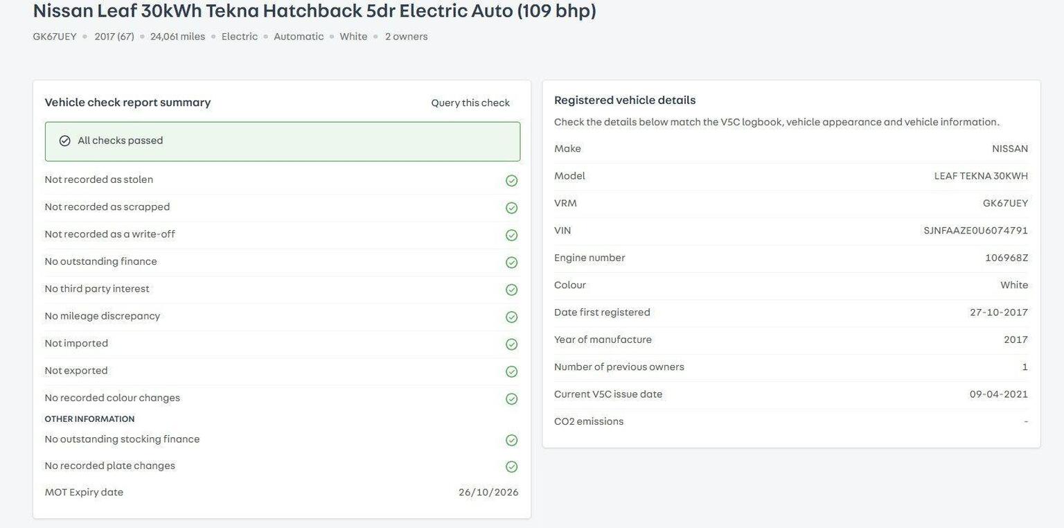 Only 2 Owners From New | Excellent Battery State of Health 11/12 Bars) | 6.6 kW Onboard Fast Charger (Additional Feature) | Leather Seats | Front & Rear Heated Seats | Heated Steering Wheel | Finance Available at Competitive Rates | Reverse & 360° Parking Camera | 1 Key | Satellite Navigation | Auto Headlights | Auto Wipers | Keyless Entry & Start | Auto Folding Side Mirrors | MOT Valid Until 27/10/2026 | 3 Months Warranty with an Optional Upgrade to 1, 2 & 3 Years | Part Exchange Welcome | Cruise Control & Speed Limiter | Climate Control with Air Conditioning | Upgraded Bose Audio System | AUX/USB/Bluetooth Media Connectivity | FM/AM/DAB Digital Radio | CD Player | Hands-Free Phone Call Connectivity | Electric Windows | Multi-Function Steering Wheel Controls | Front & Rear Electric Heated Windscreen(s) | Multi Trip Info | ISO Fix | Child Lock | Central Locking | Alarm System | Traction Control | Origional Carpet Mats | Charging Cable - Present. An Excellent Example of a Well Maintained Car.